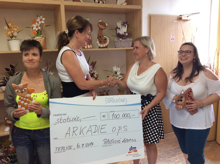 „Snažíme se vybírat takové lokální organizace, které se zaměřují na zlepšení života všech, u Arkadie se navíc jedná o tak zásadní věc jako jsou nedostatková pracovní místa,“ doplňuje Martina Horká z dm důvody zvolení. „Rozhodli jsme se v tomto případě, že organizaci podpoříme finanční částkou ve výši 100 000 Kč a materiální podporou,“ uzavírá Horká a doplňuje, že předání daru proběhne 10. července v Teplicích.
